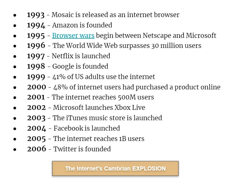 In 1989 Tim Berners-Lee invented the World Wide Web to meet the demand for automated information sharing between scientists in universities and institutes around the world. Tim worked at CERN, which is the European Council for Nuclear Research which was/is a centralized institution for European scientists/physicists to, “unite people from all over the world to push the frontiers of science and technology, for the benefit of all.” Following the creation of the World Wide Web in 1989, a Cambrian Explosion of technology innovation and company formation occurred. Here’s just some of what happened: