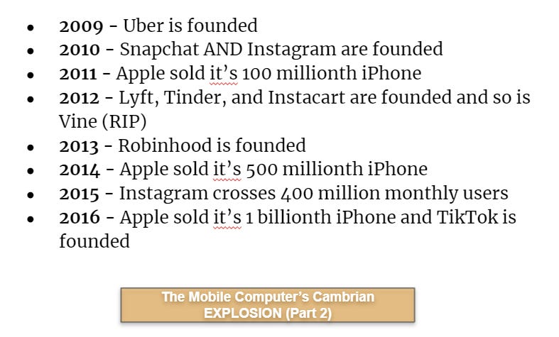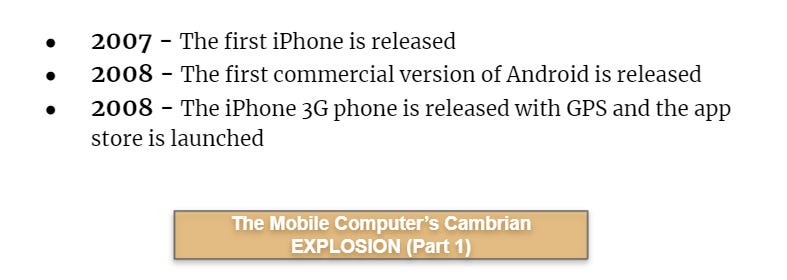 Let’s pause here for a second. Remember those step functions in efficiency that the internet and the modern computer created? Well the introduction of mobile computing takes both of those efficiencies in communication and computation and combines them into one. More or less any computational problem, and more or less any form of communication can be achieved by anyone, from anywhere provided they have access to the new tool (a mobile computer) to do so. It is fascinating to look back on how these new technologies became ubiquitous and layered on top of one another, and it’s equally fascinating to look back and observe the historical patterns within each technology innovation cycle.