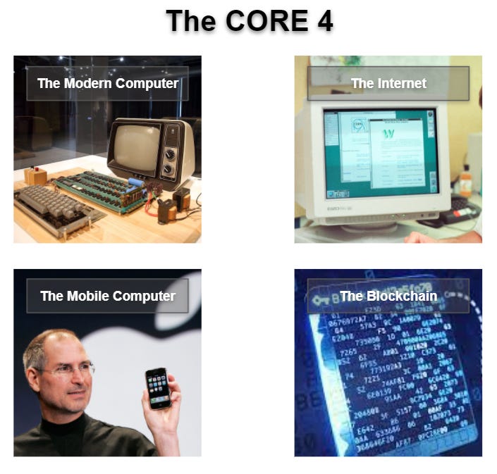 So I’m new to VC, and I’m learning the ropes. The central aspect of our job is to find exceptional founders (like many of you in this newsletter), partner with them to grow their business, empower them with the tools to succeed, and then get the hell out of the way. We do this at the earliest stages when there are little to no customers, data, or employees. It’s a wild business, but so far I’m loving the experience. So, with that in mind, it’s important, actually no it is critical, for me to be able to identify the companies today that will become the Stripes, the Ubers, the Coinbases, of tomorrow. Each of these companies was founded in the past fifteen years and each of these companies are now worth $50B+. So how the hell am I going to do that? How am I going to find these companies when they are little more than just an idea? Great question. I’m not 100% sure, but what I do feel is important, is to ground myself in a historical context on the environments that enabled those outcomes to occur. Technology innovation happens in cycles, and technology innovation is compounding. The computer needed to be built before the internet could be created. The internet needed to exist before a social network could be born. Social networks needed mobile computing in order to become ubiquitous. With that in mind, I wanted to explore the four core technology innovations that I believe have led us to where we are today: