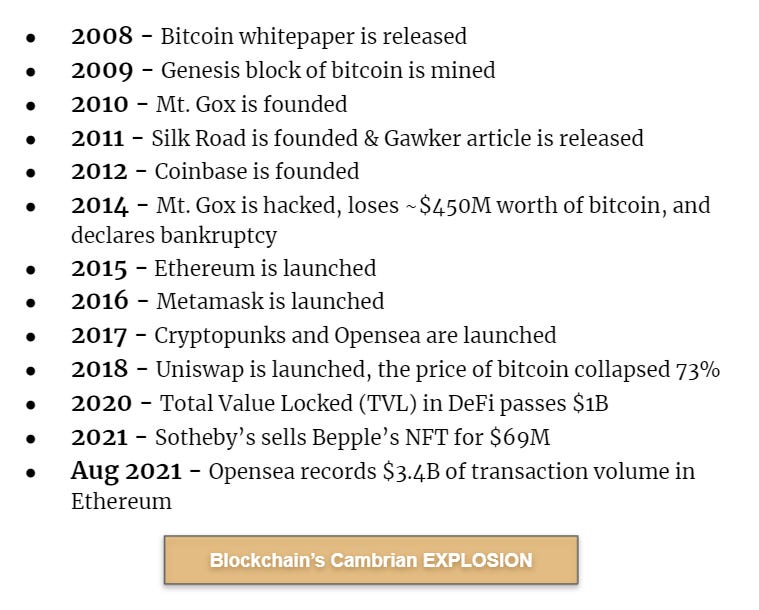 Without the internet becoming the worldwide phenomena that it is today, the blockchain era, which we are still in the early innings of, would have never begun. This entire article has been about a brief history of innovation, and I would be remiss if I didn’t reference blockchain. The blockchain era, to me, really kicks off in 2008 when Satoshi Nakamota (which is a pseudonym, and could be one person, or a group of people) published the bitcoin whitepaper. The whitepaper is highly technical, but it lays out a framework for establishing a decentralized currency that solves the double spending problem of digital cash and allows for the peer to peer transmission of “electronic cash” without the need for a centralized intermediary. I am not a historian, but in my mind the release of the bitcoin whitepaper is on par with Alan Turing’s findings in 1936, the establishment of ARPANET in the 1960s, and the release of the iPhone in 2007. One quick note, I believe that blockchain as a technology innovation is extremely important and I believe that some of the early use cases that have stemmed from the innovation of blockchain (i.e cryptocurrencies, decentralized finance, NFTs, etc) are also important, but they are the branches of the technological innovation that is the blockchain. I make this distinction to say that even though a lot of time spent on the internet is on social media, the entirety of the internet is not social media. The same thing applies to blockchain and crypto, or blockchain and defi, or blockchain and NFTs. That being said, let’s look and see what happened in the ecosystem following the launch of bitcoin in 2008